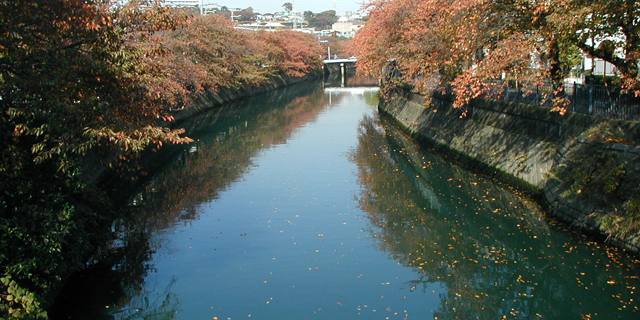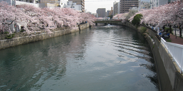川岸に沿って、桜並木が延々と続いています。河口に近い中区の様子。