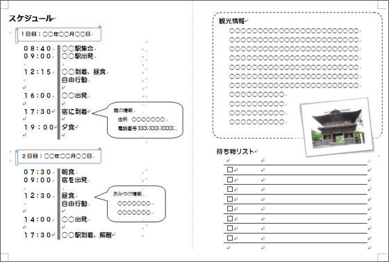 右ページの観光情報・持ち物リストは横書きテキストボックスを使用します。写真は図ツールで入れま