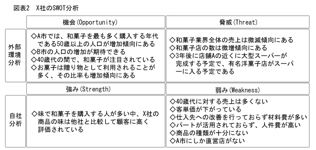 策定します◆ある地方都市で和菓子を製造・販売している「X社」のSWOT分析を図表2に例示してみまし